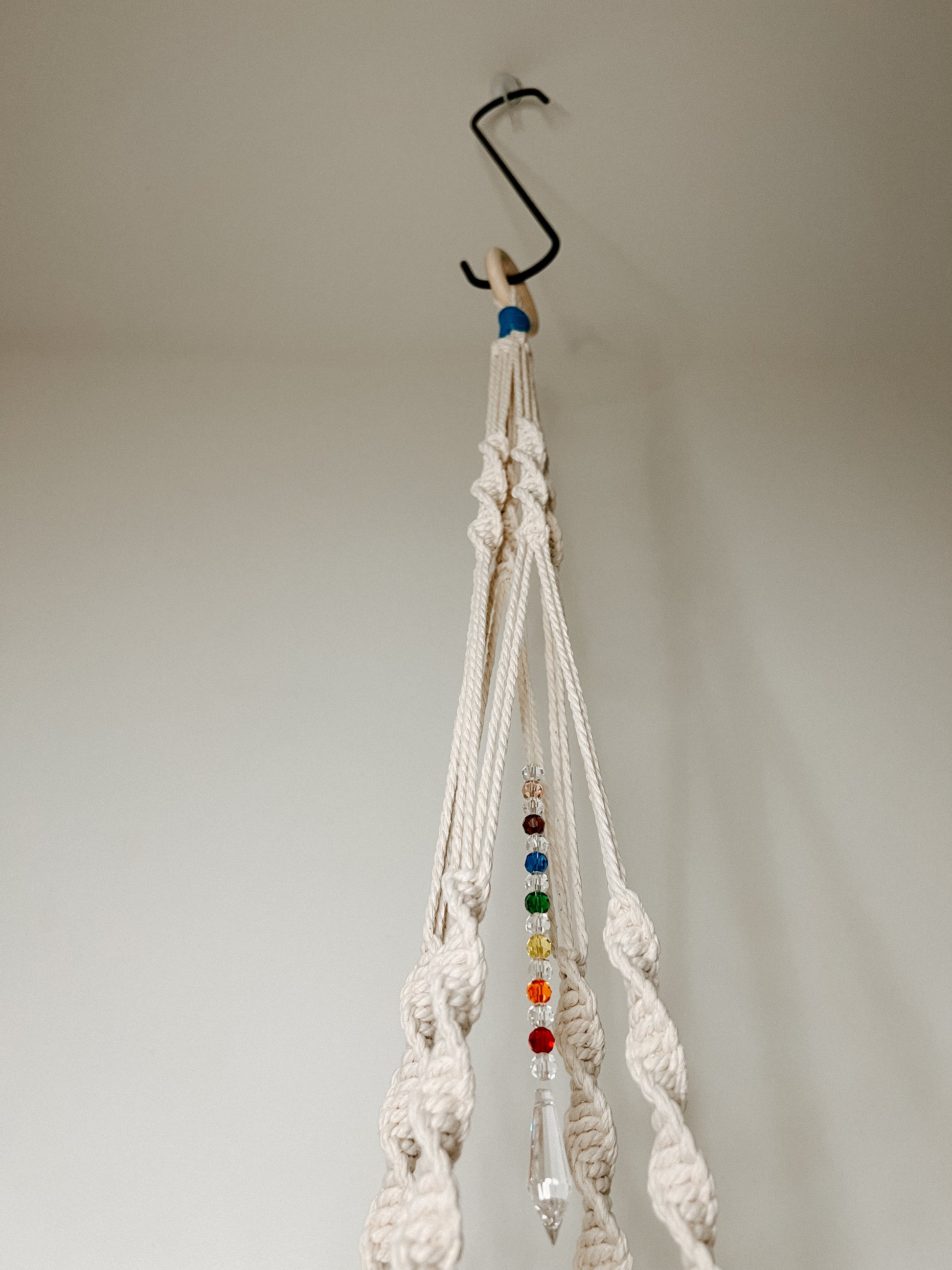 Elevate your space with this beautifully handcrafted macrame plant holder, featuring a row of vibrant chakra crystals to inspire balance and harmony. Made from durable, eco-friendly cotton cord, this minimalist yet spiritual design is perfect for showcasing your favourite plant. The crystals add a unique touch, making it both decorative and meaningful piece for any home. Ideal for 8-12" pots, this plant hanger brings a sense of peace and mindfulness to your indoor garden or meditation corner.