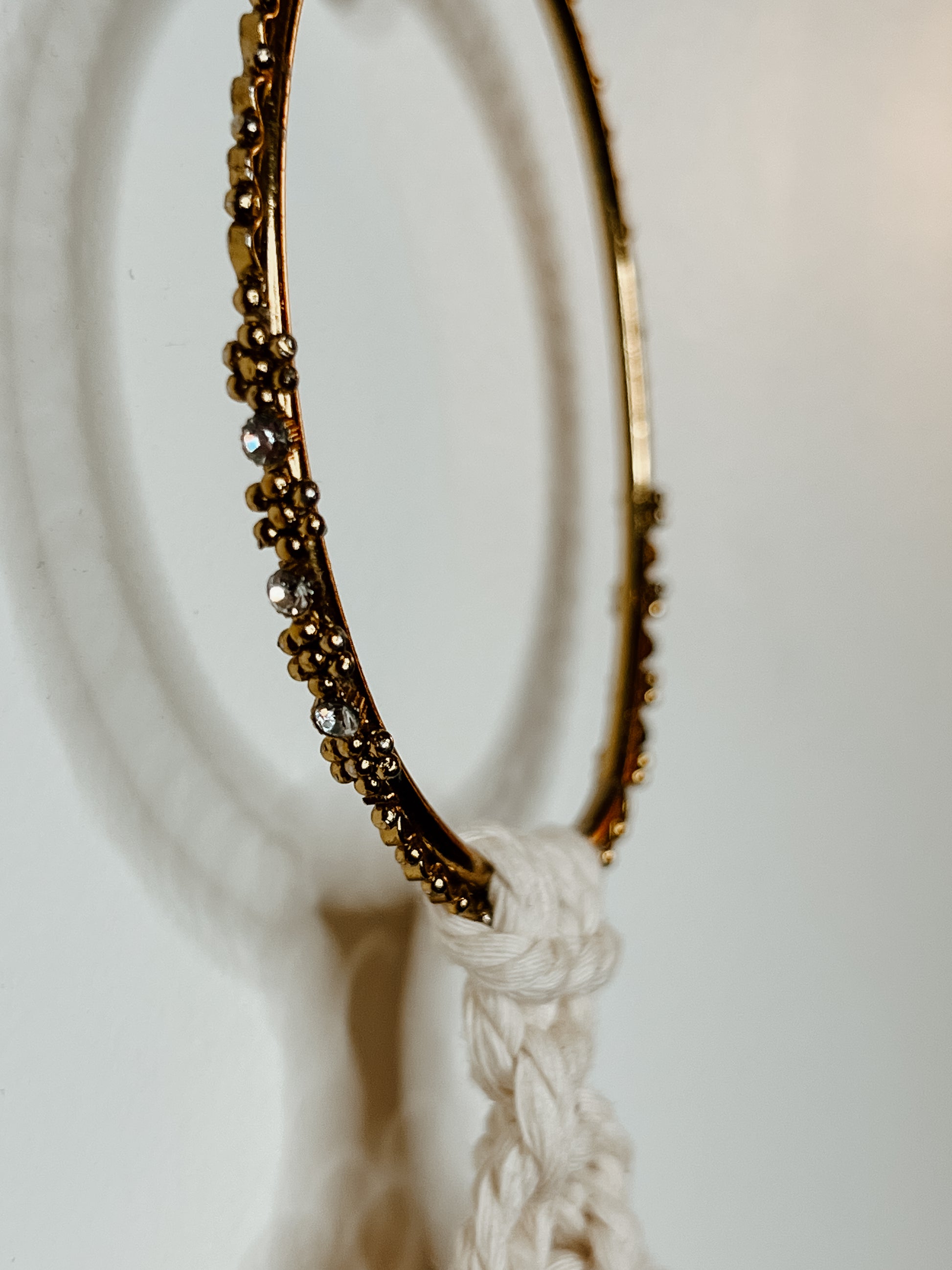 Ganesha macrame wall hanging with up-cycled beads from vintage jewelry and a Bengal bracelet. Brighten any room with this sustainable and unique piece.