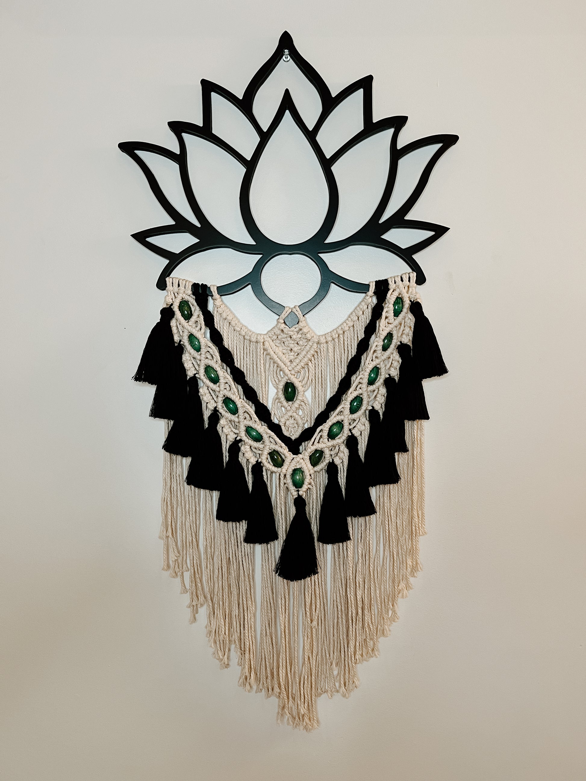 Transform your space into a sanctuary with this striking large lotus-inspired macrame wall hanging. Featuring intricate knot work, flowing tassels, and vibrant green accents this handcrafted piece symbolizes purity, growth, and spiritual awakening. The natural cotton cords are paired with bold black details, creating a captivating contrast that highlights the beauty of the lotus design. Perfect for adding elegance to your living room, bedroom, or meditation space, this unique piece serves as a reminder of balance and serenity. A stunning centerpiece for those who value artistry and intention in their decor.