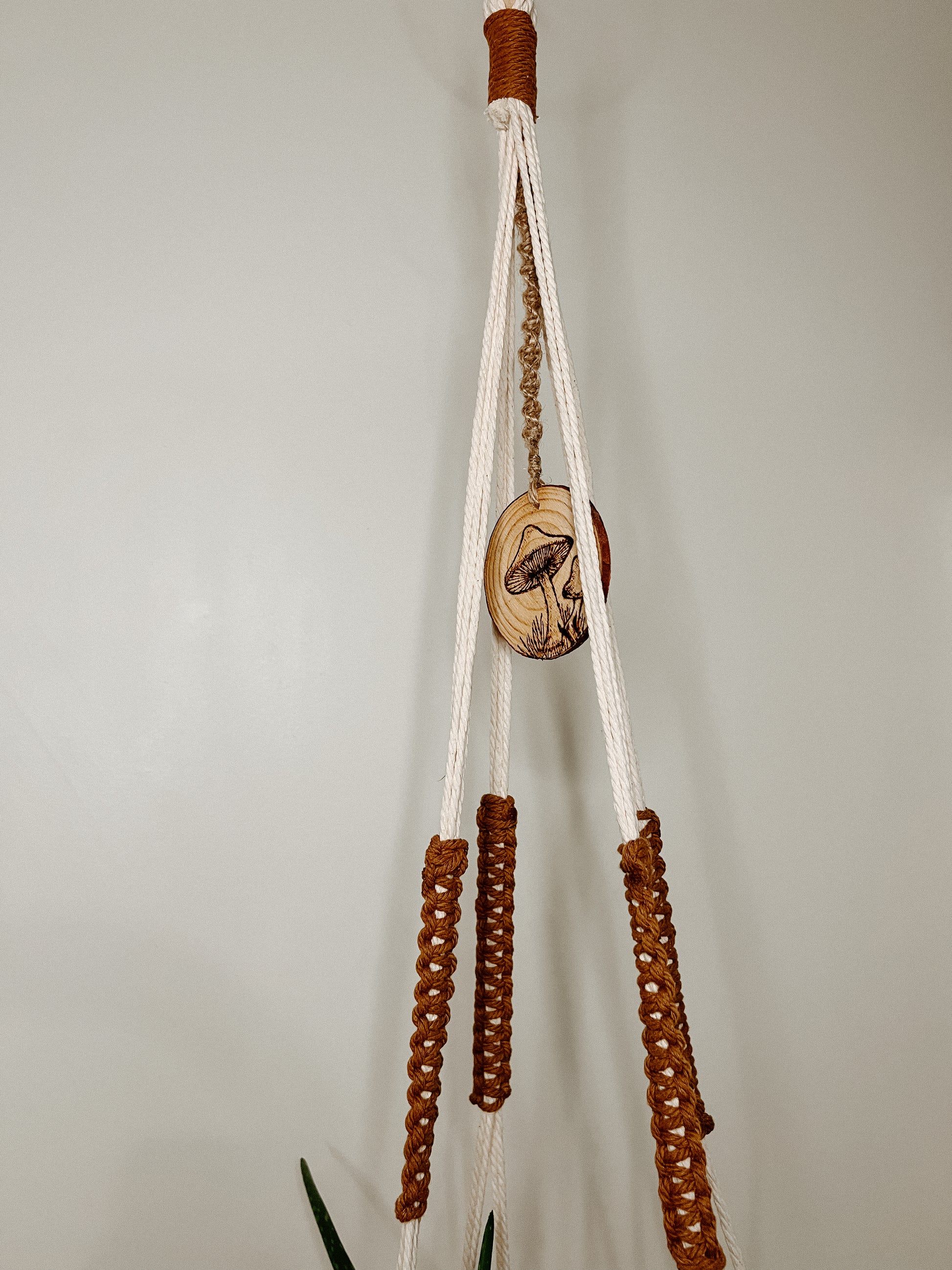Bring the magic of the forest into your home with this unique mushroom-themed macrame plant holder. Featuring a hand-burned, double-sided wooden medallion crafted by the artist, each desIgn is one-of-a-kind, adding a rustic, natural touch to your decor. Made with eco-friendly cotton cord and accented with earthy wooden details, this plant holder has no tassel at the bottom, offering a clean, miniamalist aesthetic. Perfect for holding small to medium planters, it's a beautiful fusion of art and nature, ideal for boho, woodland, or earthy-inspired spaces.